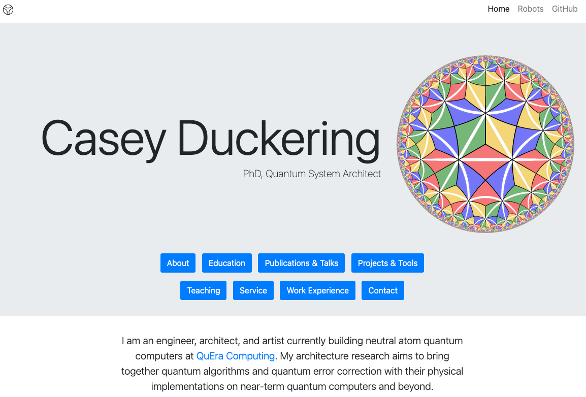 At this point I’d graduated college and moved away from my home state of California for work. As time went on I found myself wishing I had something that could hold a candle to what my colleagues had. In particular, my boss Xiu-Zhe (Roger) Luo had this really nice site made with Astro and another colleague Casey Duckering has this wonderful site made with Bootstrap.