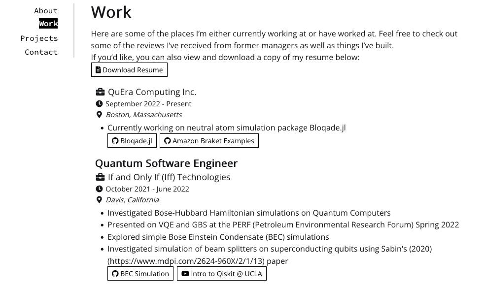 Despite all the problems I ran into, I look at the current version I have online now and still find myself quite pleased with what I was able to accomplish in learning the Liquid Templating Language Jekyll natively supports. I’m especially happy with the “Work" page that I made and I have yet to find a template that has as many “batteries-included" options I managed to glue together for linking projects and specifying job locations. That’s probably the one permanent skill I gained from this second iteration.